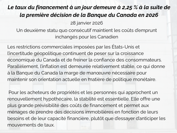 Voici notre infolettre pour le mois de février 2026. Vous y trouverez plusieurs informations pertinentes au sujet de l'immobilier. N'hésitez pas à nous contacter si vous avez des questions.